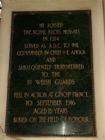 By 1911 he was boarding at Eton College in Windsor, Berkshire. It was whilst he was studying at Eton when war broke out & in March 1915 aged 18 he enlisted in the Royal Bucks Hussars. When returning from East Africa in April 1916, he transferred to The Welsh Guards & was sent to the front. He saw action at the Battle of Loos & the Battle of Delville Wood & it was during this battle, east of Longueval on the Somme that he was shot & killed.