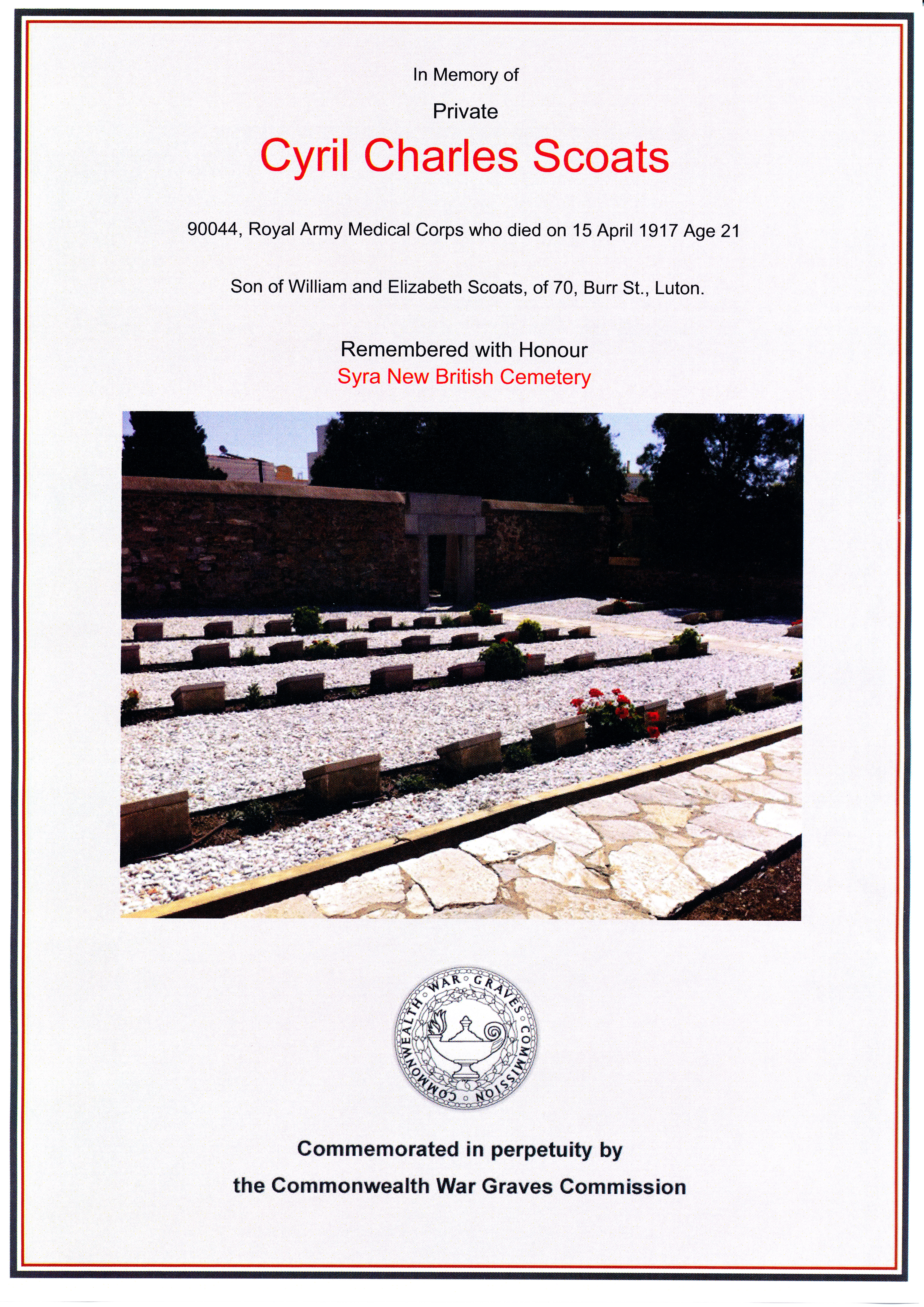 Cyril was the son of William Scoats, a straw hat manufacturer of 70 Burr Street, Luton. He joined the Royal Army Medical Corps in 1915 and was sent to Egypt in 1917. He drowned when the troop carrier Arcadian was torpedoed by an enemy submarine on 15th April 1917 in the Aegean Sea. His body was recovered and he is buried in a military cemetery on the Greek island of Syra with other casualties from the Arcadian.