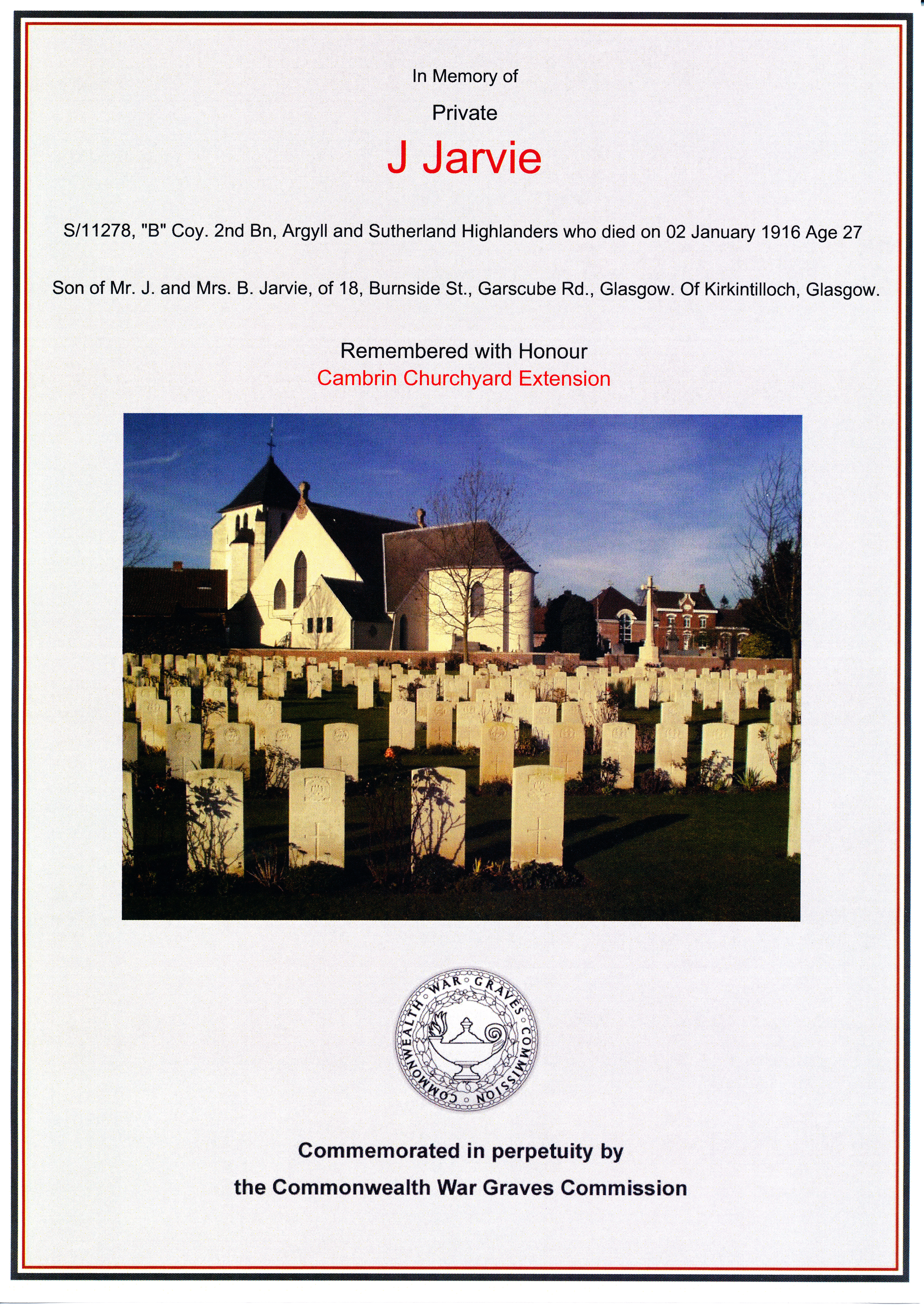 The Commonwealth War Graves Commission record that the remains of Private Jarvie were buried in Cambrin Churchyard Extension.