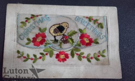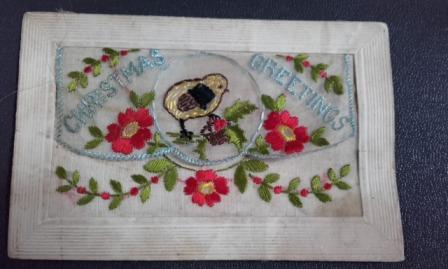The greeting card is made of embroidered silk mounted onto a postcard. These were created by French and Belgian women to sell as souvenirs to soldiers posted on the Western Front.