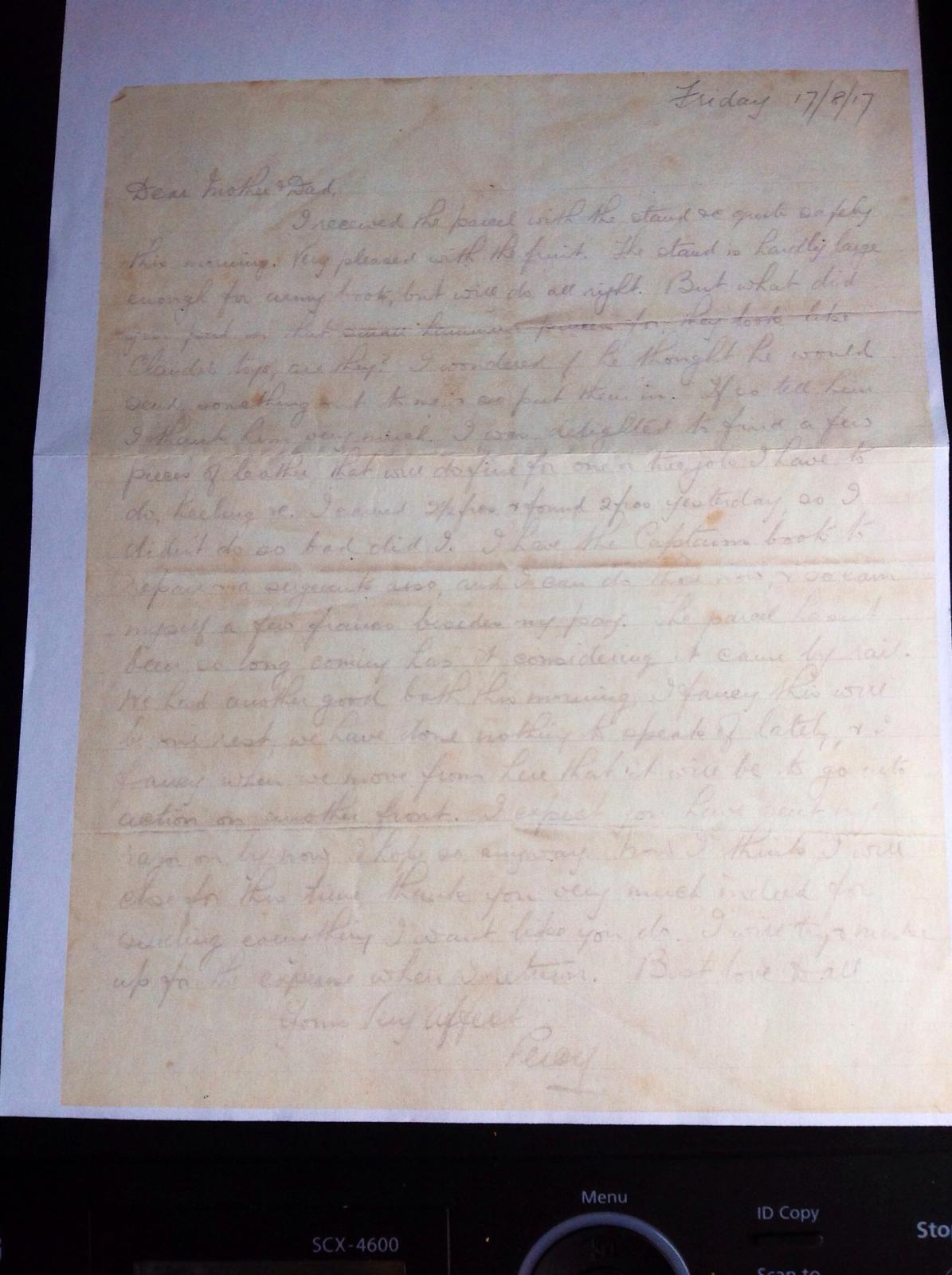 Cyril thanks his parents for some fruit and a "stand" He would have used the stand when repairing boots.