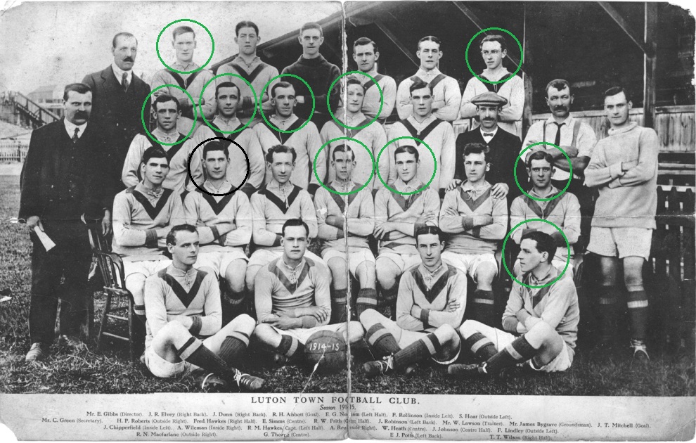 At the start of the 1914-15 season Luton Town had just been promoted to the First Division of the Southern League. Despite many of their players enlisting they were able to continue the season partly as a result of a number of players who had joined the Footballers Battalion being allowed to continue turning out to play before going overseas.