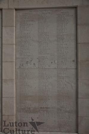 Images of the names of the fallen from the Bedfordshire Regiment remembered on the Tyne Cot Memorial, Zonnebeke, Belgium.
